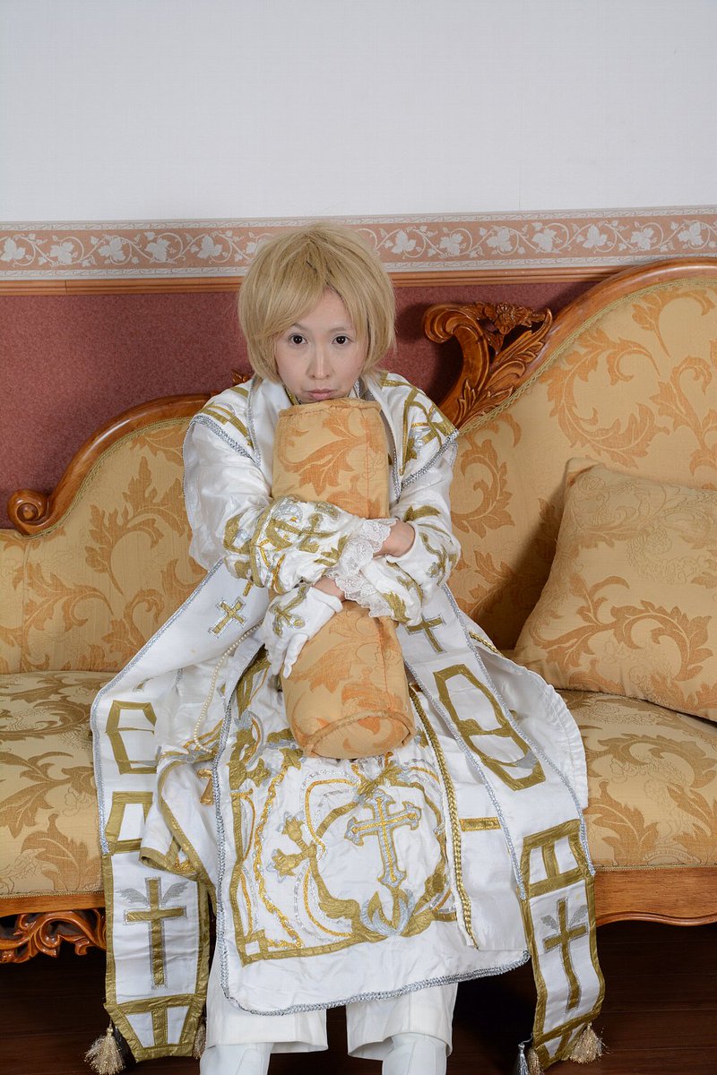 #20211024_トリブラエア併せ 素敵な企画をありがとうございます。 前の写真ですが、聖下で参加させて頂きますね。 衣装は家族作。 一枚目はトリブラタロットのポーズを意識して撮ってもらいました。神学大全のVer.を元に、普段ケープに隠れがちなストラやカソックにも模様を入れてもらいました。
