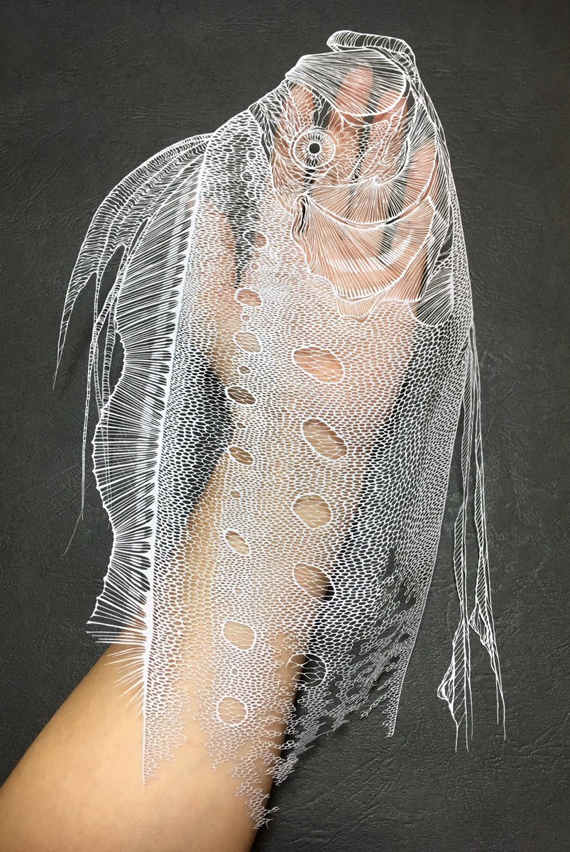 シャーペンで描いた下絵をカッターで切り抜く単純な作り方の切り絵を作っています。 彩色はせず、曲げたり折ったりもせず、切った作品を黒い台紙に置くのみでどこまでの表現が出来るかに拘っています。 …と言いながらも額装する前には手載せも楽しみます。 #2022年になったので自己紹介 #切り絵