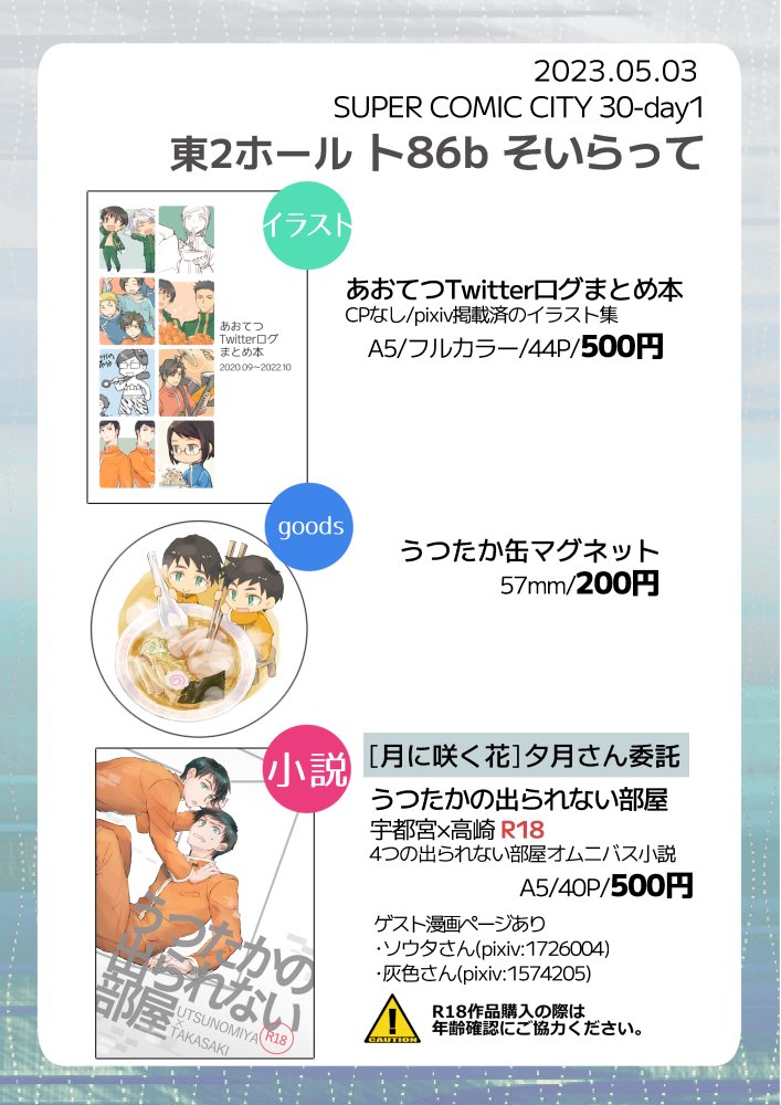 #20230503青の日報告知 タグ失礼します! 当日のお品書きです。 無配と間に合えば水彩原画を持っていきます🙆♀️ よろしくお願いします👏 新刊サンプル↓ pixiv.net/artworks/10758…