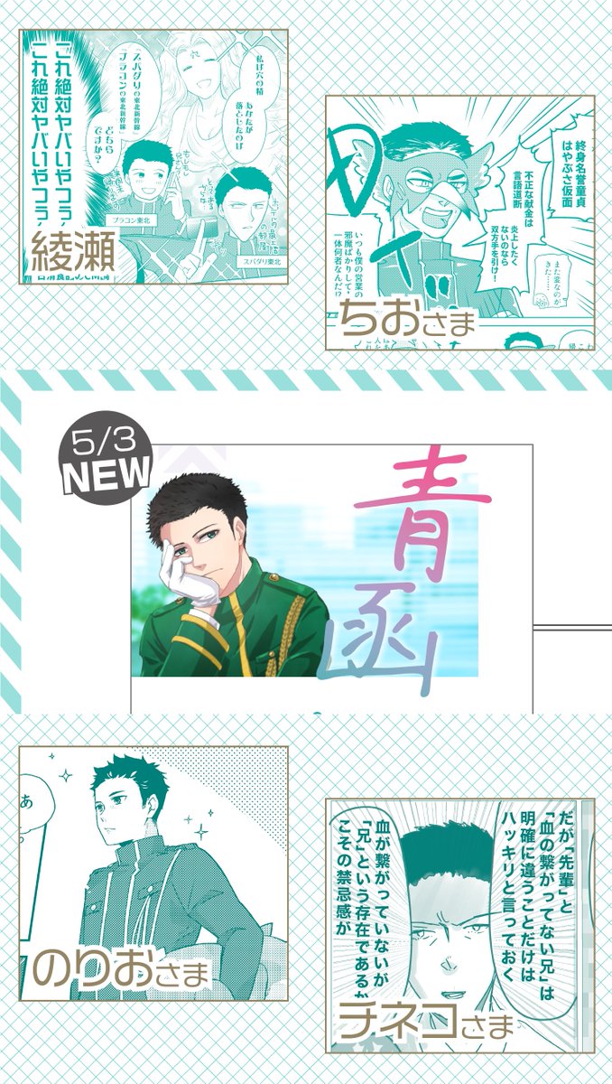 #20230503青の日報告知 当日のお品書きです🙆♀️ 新刊+ペーパー漫画(つるジュニ)+ポスカ(せーぶ)が新しく机に並びます🤝 新刊はゲストに3名寄稿いただいてます💕最高なので何卒…。 通販もイベント後行う予定なので、よろしくお願いします🦑🦑🦑 (ツリーに新刊/既刊サンプル載せてます!)