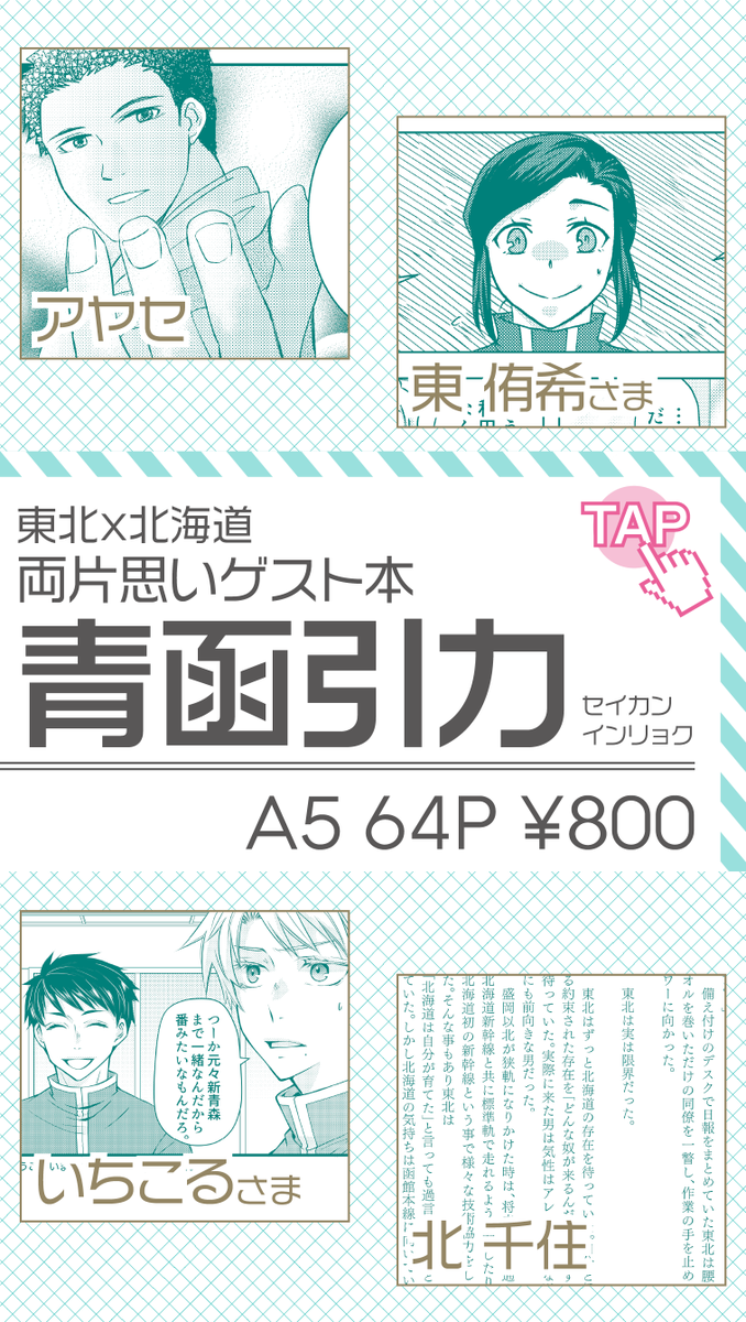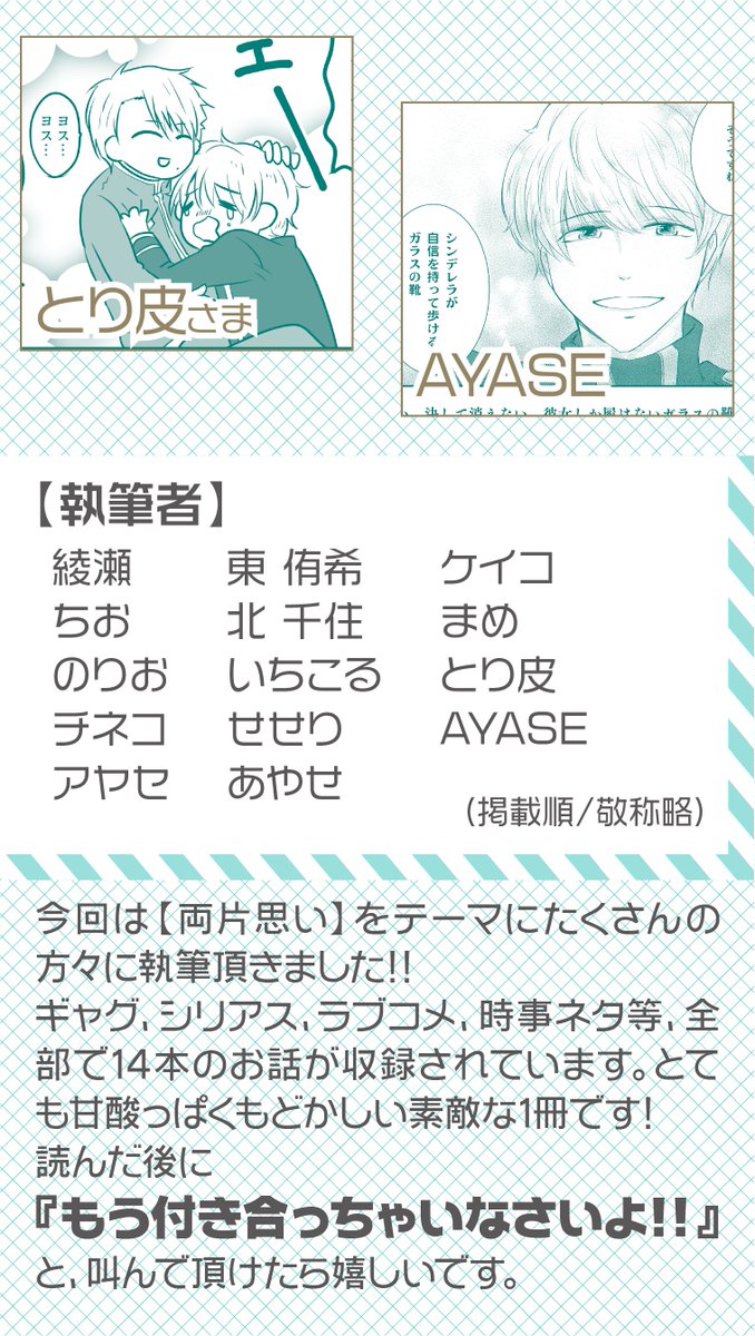 #20230503青の日報告知 ■ア23ab 新刊:ほぐどー両片思いゲスト本 【青函引力】 今回はたくさんの方々に両片思いをテーマに執筆頂きました(画像タップでサンプル開きます) 執筆者一覧/50音順 東侑希様 (@azuma133d) いちこる様 (@ichicorucoru) ケイコ様 (@keikothetokyo) 続く→
