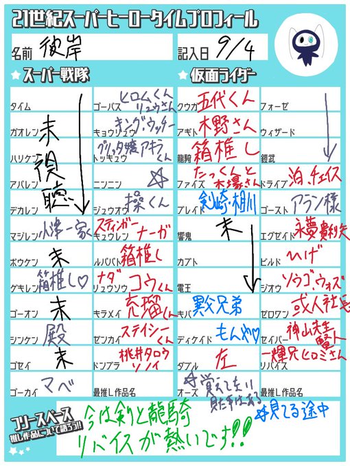 基本龍騎と現行 特にキングオが熱いんですが多分追加戦士を推しそう あと推し俳優とか推し歌い手とかアクション映画とかとか雑多ジャンル垢です 最近いうほど絵を描いてない オタ活エンジョイ勢ですがよろしければ🙌 #特撮絵描きさんと繋がりたい #GWはフォロワーさんが増えるらしい #21C_SHTprofile