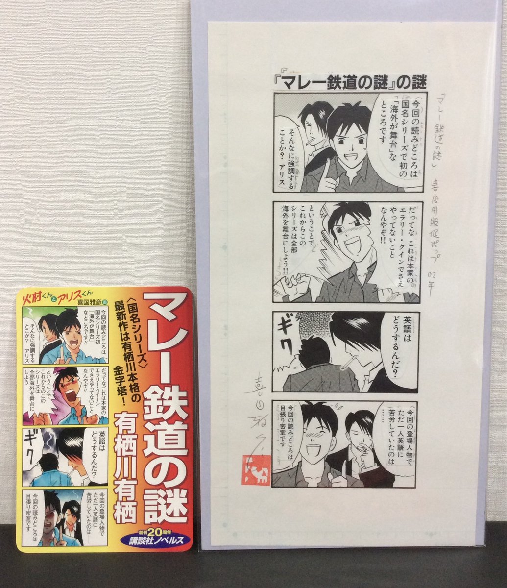 今年の出品作品ご案内(024) 4コマ『マレー鉄道の謎』の謎 有栖川有栖さんの販促POP用に描いたものですが、原稿が行方不明で「メフィストの漫画」収録時に描き直しました。POPも同封で出品します(雅)。 #MはミステリとメタルのM展 #22年10月13日〜19日 #吉祥寺リベストギャラリー創