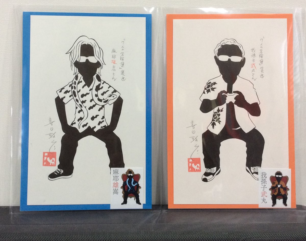 今年の出品作品ご案内(015) 『7人の名探偵』表紙原画のうち、我孫子武丸氏と麻耶雄嵩氏。椅子はデジタル合成なので、原画には描かれていません。麻耶くんが蛇を巻いているのは、僕が入手した写真がそうだったから(雅) #MはミステリとメタルのM展 #22年10月13日〜19日 #吉祥寺リベストギャラリー創