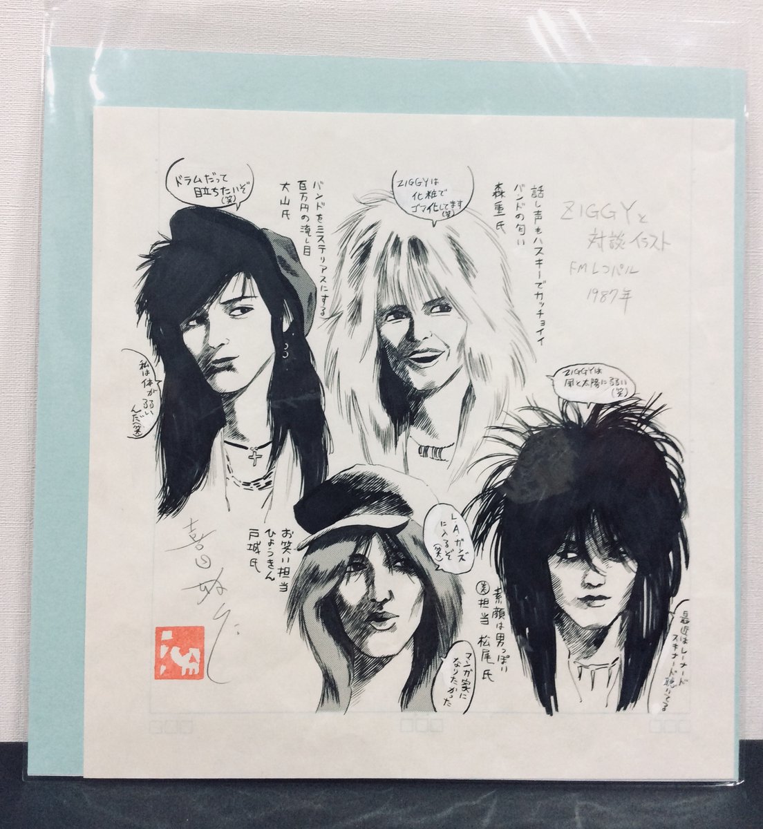 今年の出品作品ご案内(019) ZIGGYのイラスト原画。 87年、FMレコパルにてZIGGYと鼎談した際に描いたもの。うひゃあ、35年も前じゃないかあ。 宝島で連載してた「今月のZIGGYさん」の原稿は、残念ながら未返却(雅)。 #MはミステリとメタルのM展 #22年10月13日〜19日 #吉祥寺リベストギャラリー創