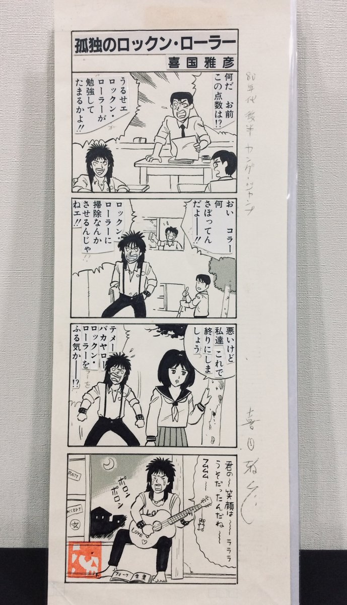 今年の出品作品ご案内(053) 4コマ「孤独のロックン・ローラー」(ヤングジャンプ、87年) ヤンジャンに5年ぐらい持ち込んでダメだったのに、ヤンサンで「傷天」が始まった途端に依頼がw 一回だけ描きました(雅)。 #MはミステリとメタルのM展 #22年10月13日〜19日 #吉祥寺リベストギャラリー創