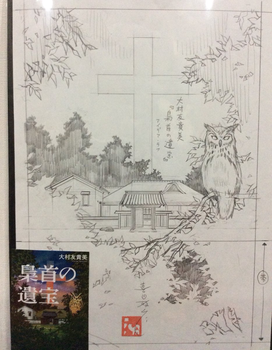 今年の出品作品ご案内(059) 大友友貴美著『梟首の遺宝』(KADOKAWA)のカバーイラスト下描き。コピー用紙に鉛筆。 完成イラストは四年前の個展時に、フクロウマニアの友のところに嫁いでゆきました(雅) #MはミステリとメタルのM展 #22年10月13日〜19日 #吉祥寺リベストギャラリー創