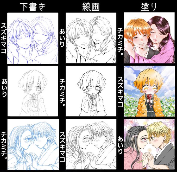#3人で下書き線画塗りを交換して絵を完成させる 祥ちゃんの呼びかけで集まったこの企画 祥ちゃん・avyちゃん・私のグループも完成したので見てください😆 うちのグループは「最高に可愛い禰󠄀豆子ちゃん」で描かせていただきました えっ真ん中の段おかしいだろって? 誰がどう見ても🎀ちゃんですが?