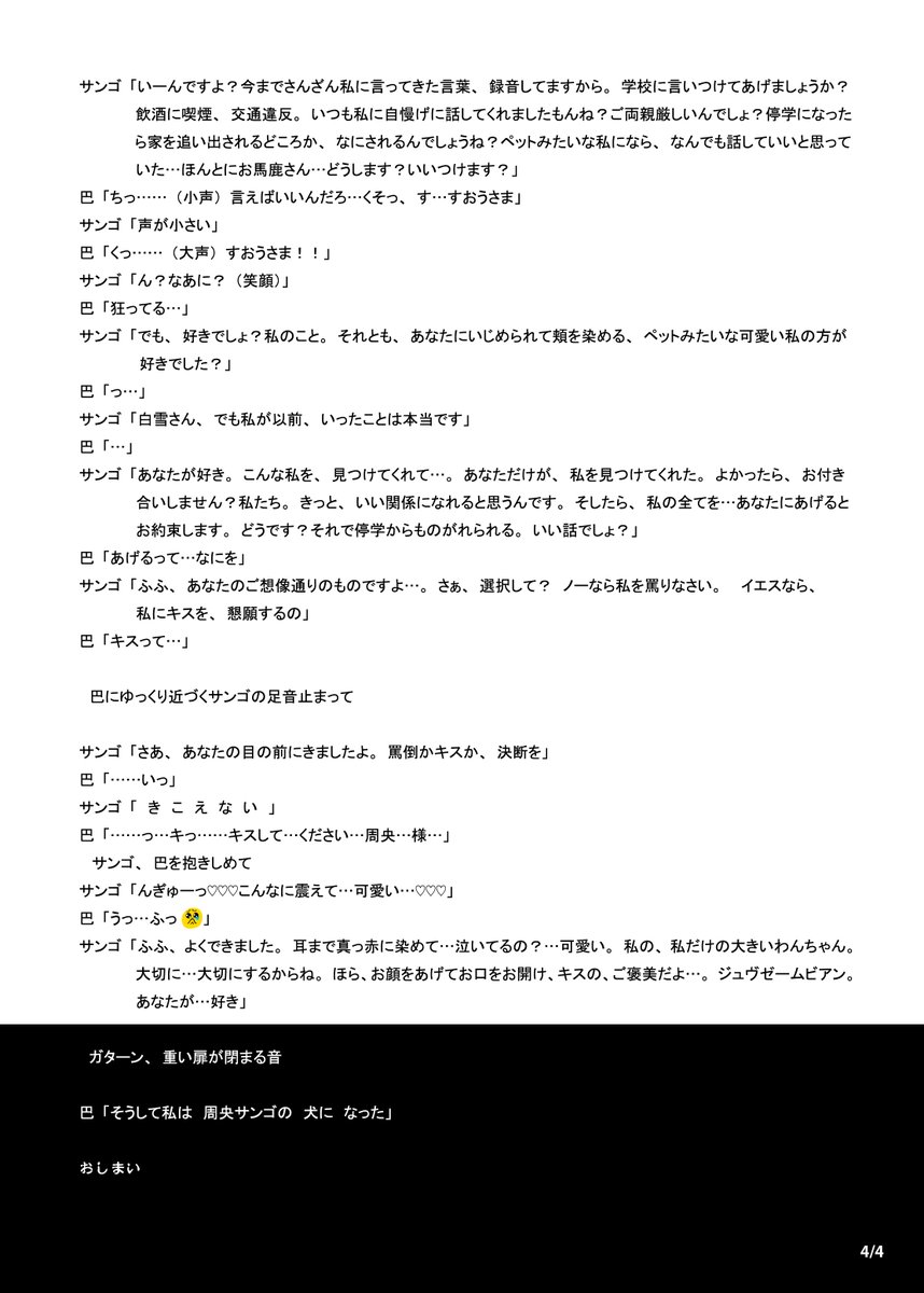 (1/2)主従逆転百合ものの台本になります。声劇!ンゴ様がいらっしゃる日がいつか来ると思いずっと前から書いておりました!狂気的演技で場を制するンゴ様がみたい!!そして、完璧にいじめられる巴さ…じゃなくて普段とは違う巴様がみたくて書きました!リプに続く #3分バーチャル劇場15ステ