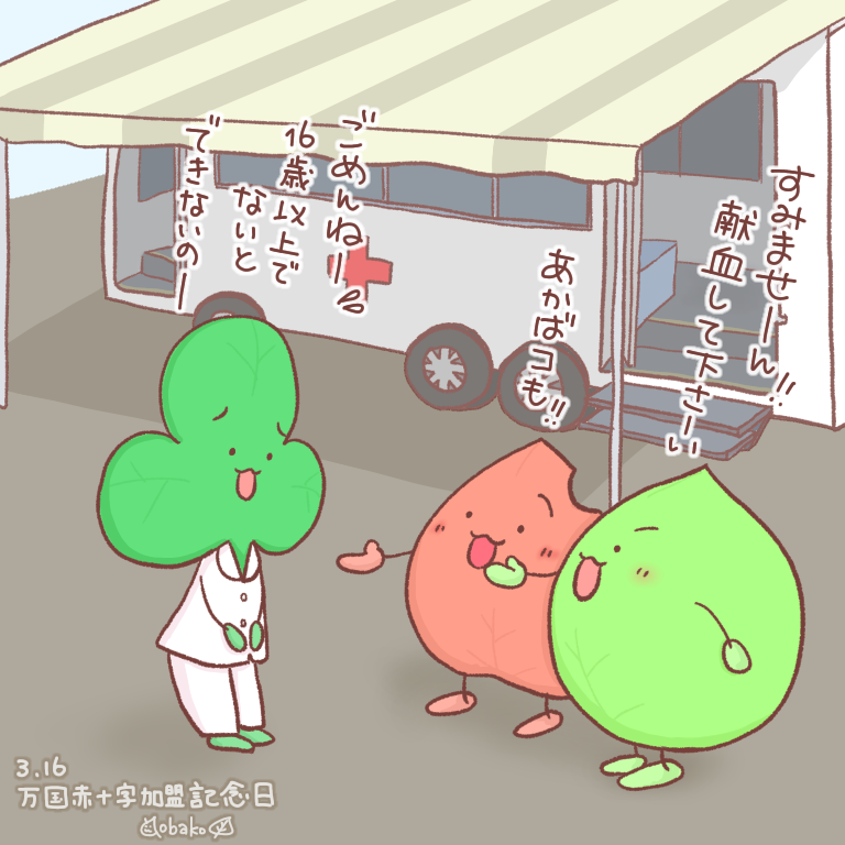 おはばコ~☀️ 今日は「#万国赤十字加盟記念日」だよ🏥 献血カーが来てたからやってみようと思ったんだけど あおばコたちまだ子供だからできないんだって😣 おっきくなったらやるんだ #人間には輸血できない #今日は何の日 #3月16日 #一日一絵 #あおばコ #1コマ漫画 #1コマイラスト #アトリエの系譜S8