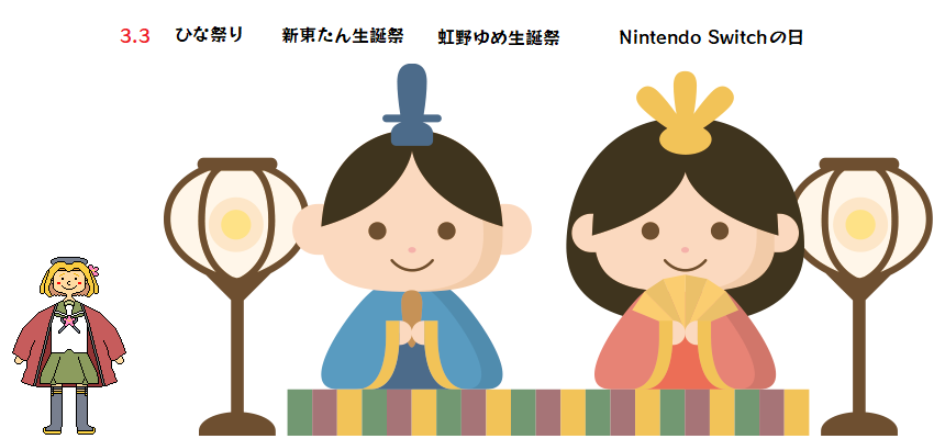 本日は、ひな祭りと虹野ゆめ生誕祭とビックカメラ新宿東口駅前店@Bic_shintouekiが開店されてから13年目が経過とNintendo switchが発売されて6年目が経過しました。 #虹野ゆめ生誕祭2023 #3月3日は新東たんのバースデー #ビッカメ娘を描き隊 #新東たん
