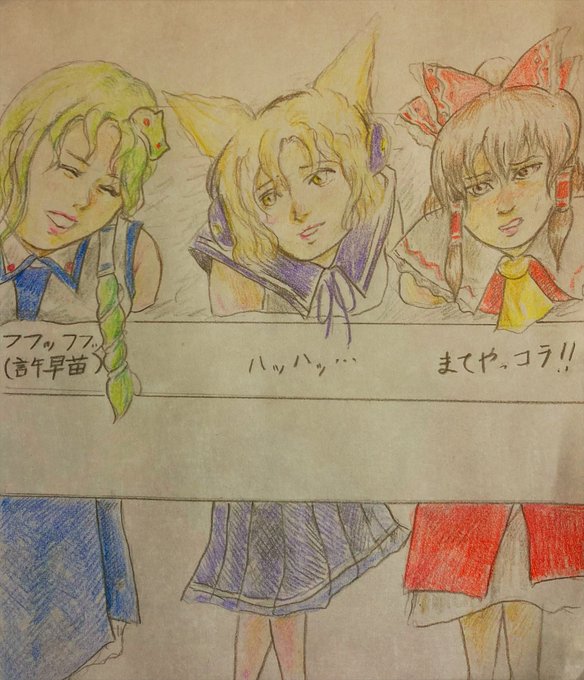 いっぱい間に合ってないはずなのに バッテリーチャージが全くもって出来てない🥺ので再掲です #3月5日は巫女の日 #3月5日は神子の日 #博麗霊夢 #東風谷早苗 #豊聡耳神子 #驪駒早鬼 #東方project #アナログ絵