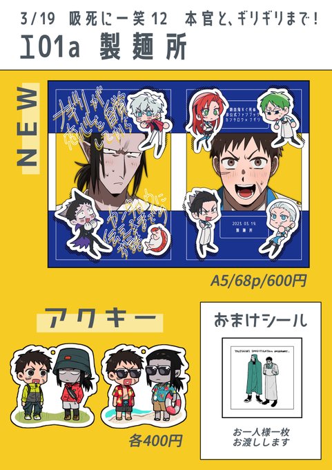 🍜3/19吸死に一笑12のお品書きになります🍝 サークル参加者様向け取り置き受け付けます🙌 トリオキニもしくはDMからお申し付けください~ 【トリオキニ】triokini.com/circle/item/li… 【新刊サンプル】pixiv.net/artworks/10589… 当日よろしくお願いします‼️ #319官ギリ新刊