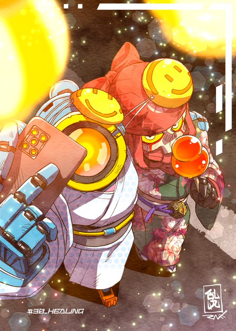 30_HEALING オフはおデート💕 レ「なんでわざわざ端末で記録するんだ。お前の頭に正確に記録されてるだろう」 パ「だって君と一緒に映りたいんだ。思い出に足すのもわるくないでしょ?」 レ「(唸り声)」 #100日チャレンジ #31DaysInTheOutlands #ApexLegends #ApexLegendsFanart