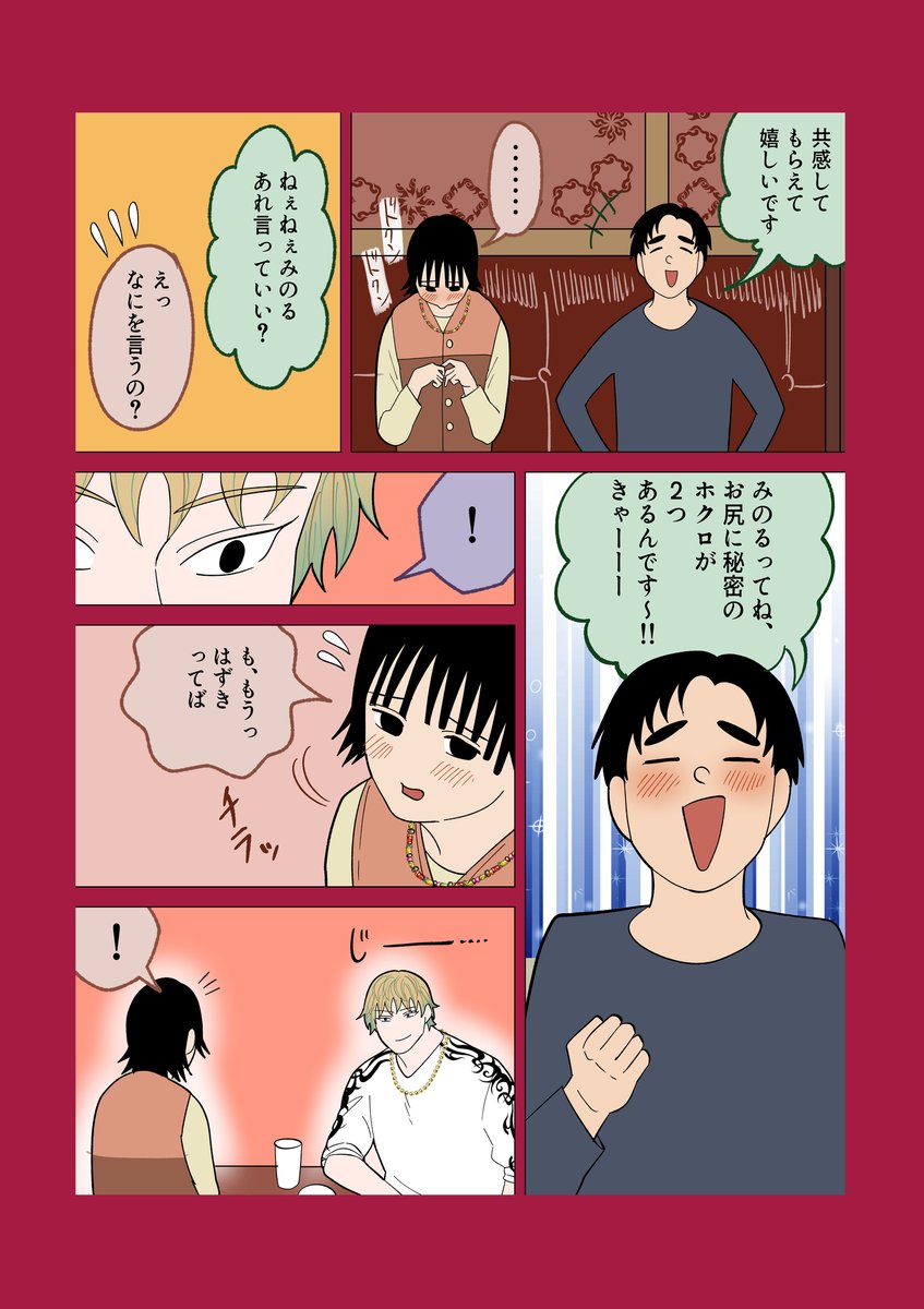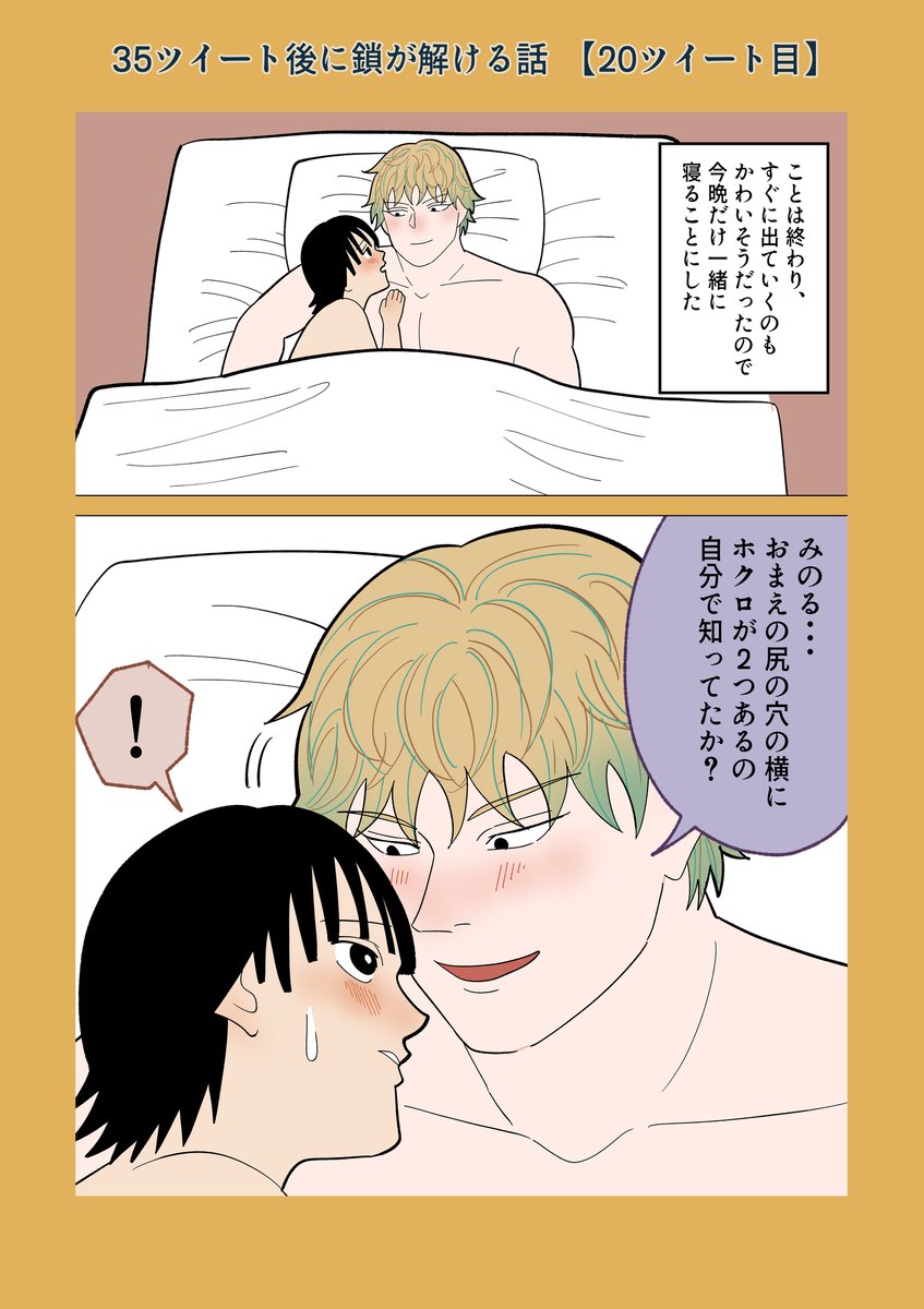 【#35ツイート後に鎖が解ける話】 34ツイート目 みのるくんの秘密のホクロ・・・、実は前に竜星はみのるくんと夜の営みをした後、ホクロについてみのるに話していて(覚えている人いるか知らんけど)、ちょっとした伏線でした。っていうね さて、 残り1ツイートで完結です。 #創作BL #創作BL漫画