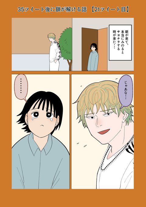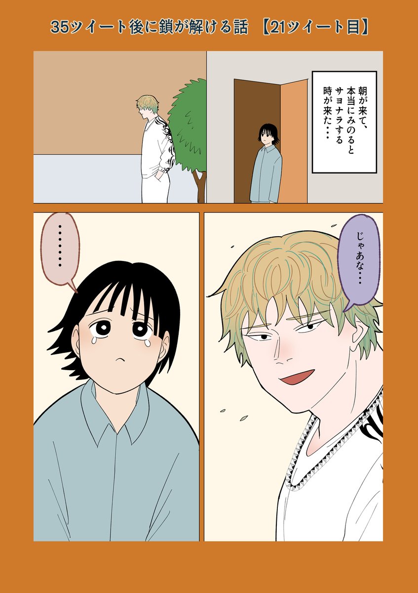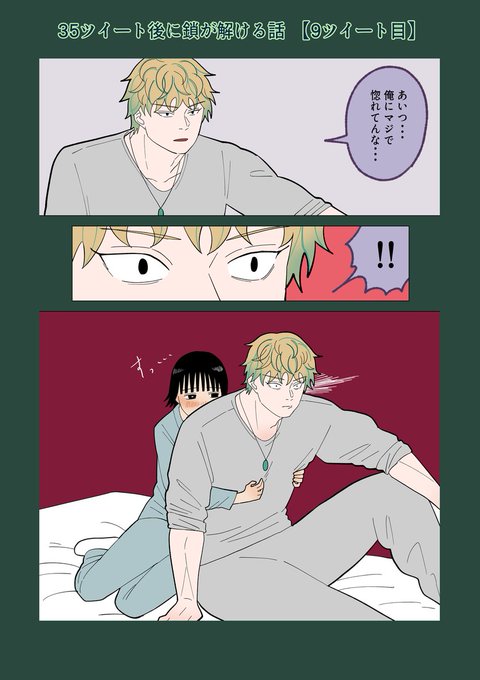 【 #35ツイート後に鎖が解ける話】 ☆完結☆ 今日は昼に34ツイート目を投稿しましたが、最終回が描き終わったので、投稿してしまいます! いやー!!完走できてすっきり!! ここまでお付き合いいただきありがとうございました! ※ただ、この話には続編があります #創作BL #創作BL漫画