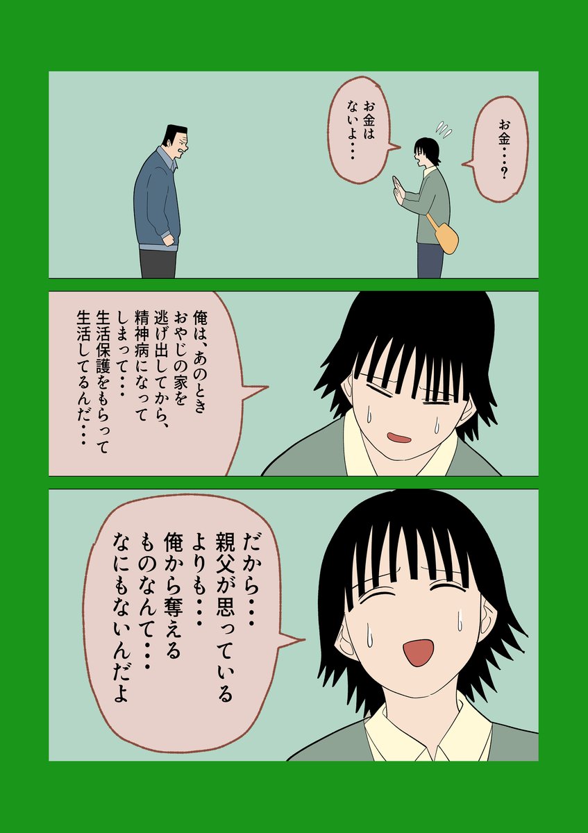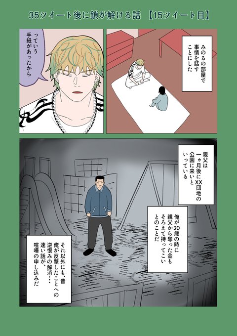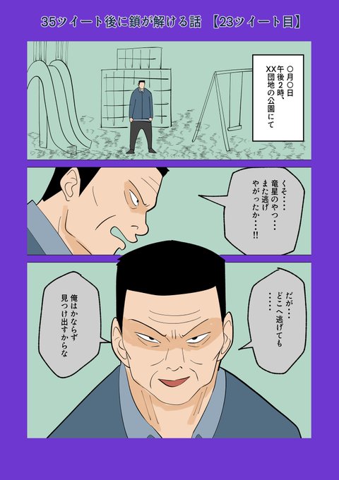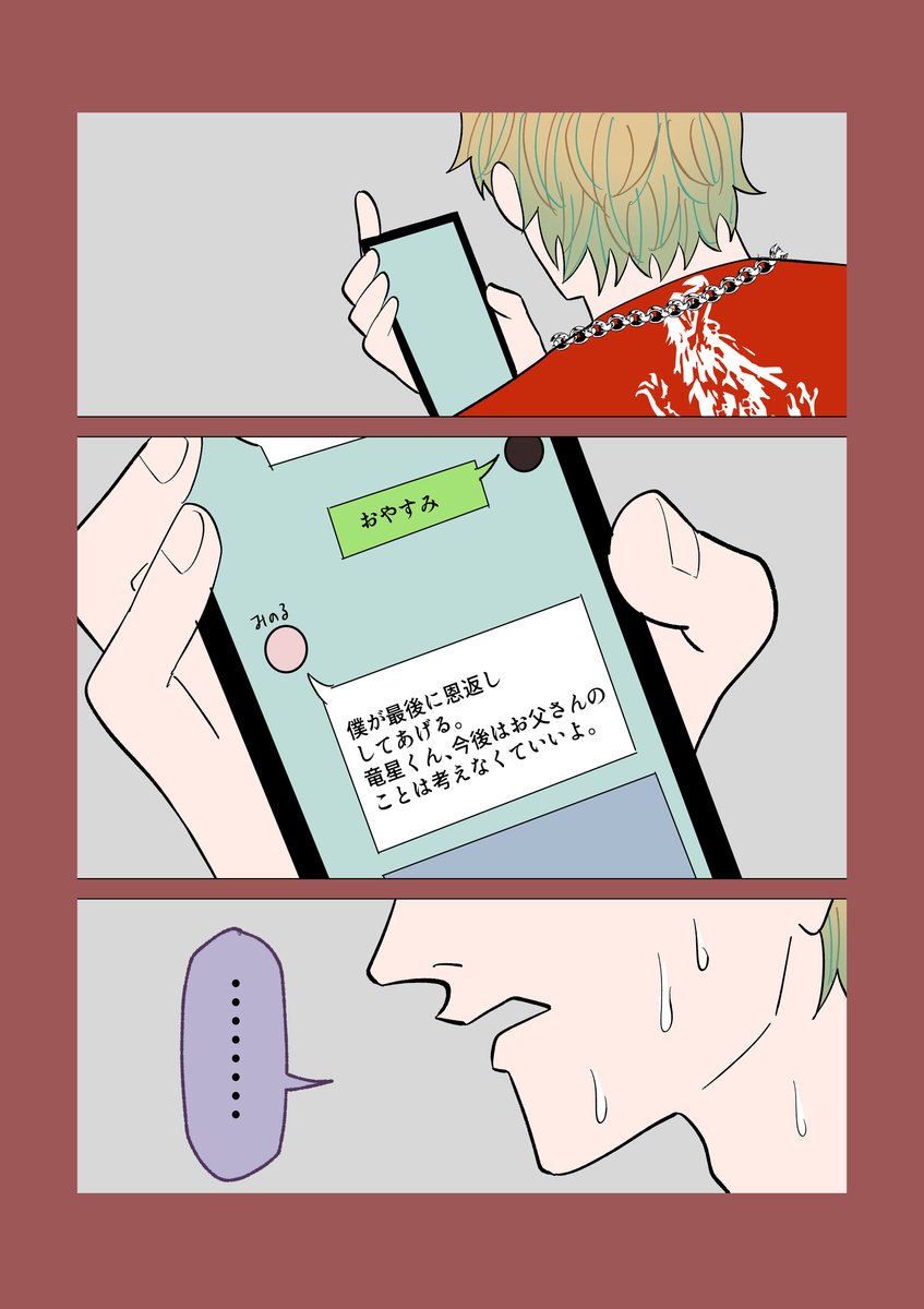 【#35ツイート後に鎖が解ける話】 23ツイート目 一方竜星の親父は、予定通りXX団地前の公園にいました。そしてその親父を呼ぶ声・・・竜星は今仙台にいるはずだが・・・??? 残り12ツイートで完結です! #創作BL #創作BL漫画
