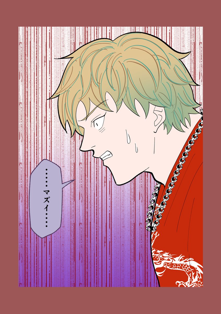【 #35ツイート後に鎖が解ける話】 25ツイート目 みのるが危ない・・・!!! それにしても竜星は赤い上着があまり似合わないな。逆に白が似合うんだけど、このまえも白を着せたし、同じのを着せるわけにもいかず・・・ #創作BL #創作BL大豊作まつり #創作BL