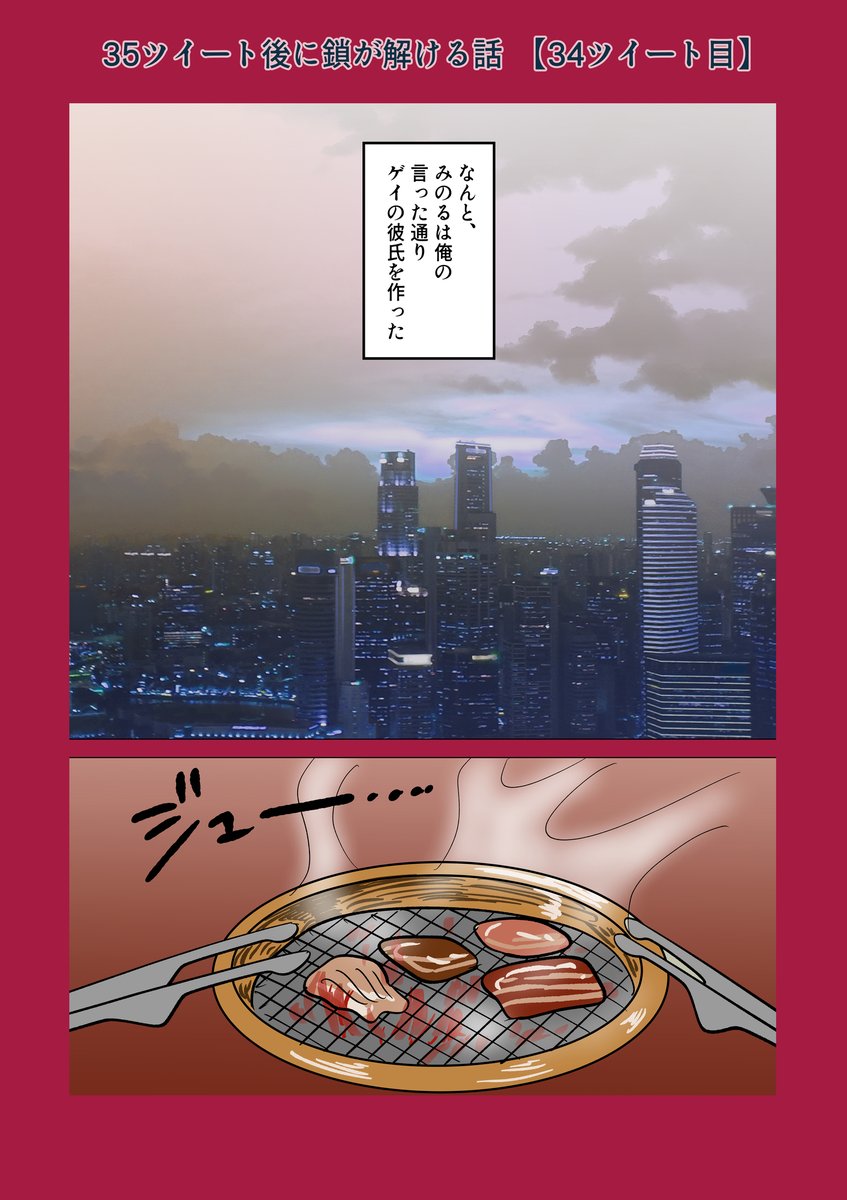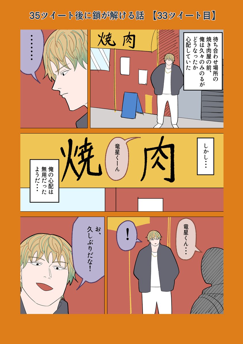 【 #35ツイート後に鎖が解ける話】 33ツイート目 みのるから誘われた焼き肉屋、 一ヵ月ぶりに会うみのるからの報告とは・・・ ちなみにみのるが焼き肉屋を選んだ理由は、竜星が焼肉が好きだからです。 #創作BL #創作BL漫画