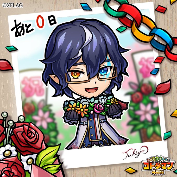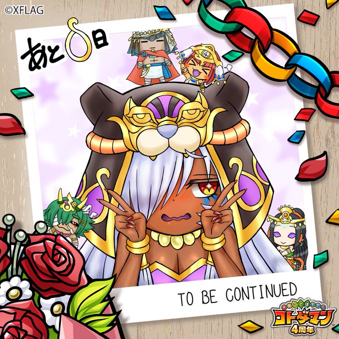 コトダマン4周年おめでとうございます🎊(公式作家さんによる集合絵間に合わなかったので)(ちょうど降臨4キャラデザインしてたので) #4周年コトダマアート #コトダマン #コトダマン4周年