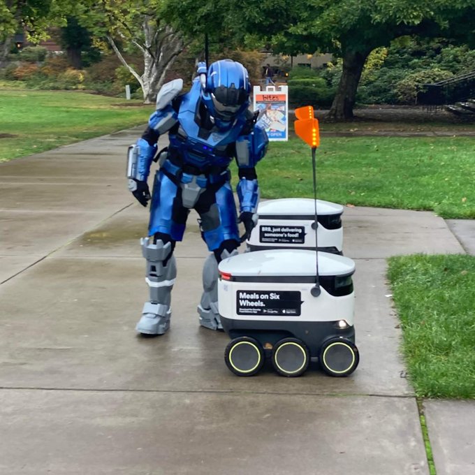 Tried to communicate with the food delivery robots at OSU, but they were unresponsive, #oregonstate #cosplay #halloween #halo #haloreach #noble1 #405th