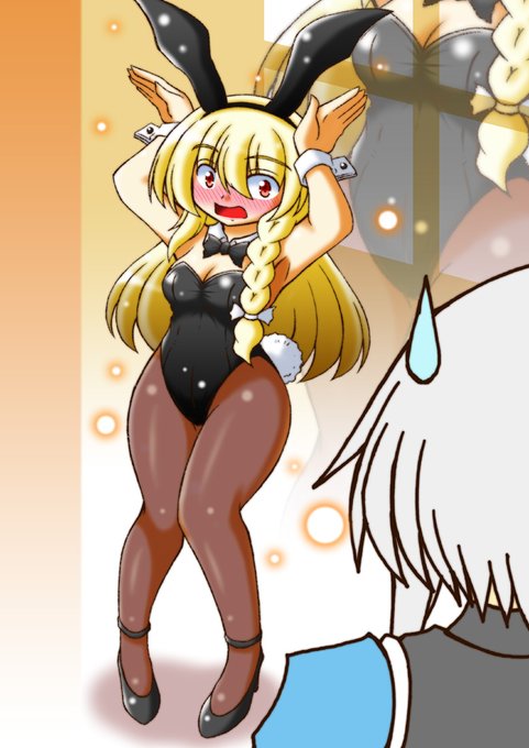 #5月16日は恋色の日 #5月16日は魔理沙の日 #東方Project 本日は卯年の恋色の日、という事でバニー魔理沙寸劇の再掲にて便乗失礼致します。バニー衣装で香霖の前に出たらどんな反応するだろうかとワクワクしてるトコを思いっきり先に霖之助に見つかってしまった魔理沙、という事で…。