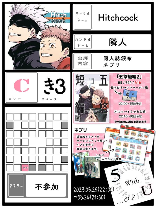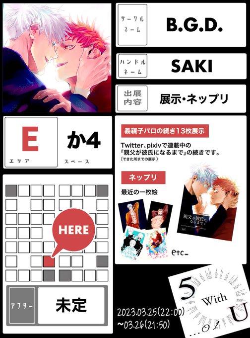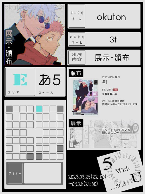 webオンリー「5 With U」のお品書きです。 ・新刊 3月25日 22:35から頒布 ・既刊 3月25日 22:25からシークレット頒布 よろしくお願いします☺️ #5withU01おしながき