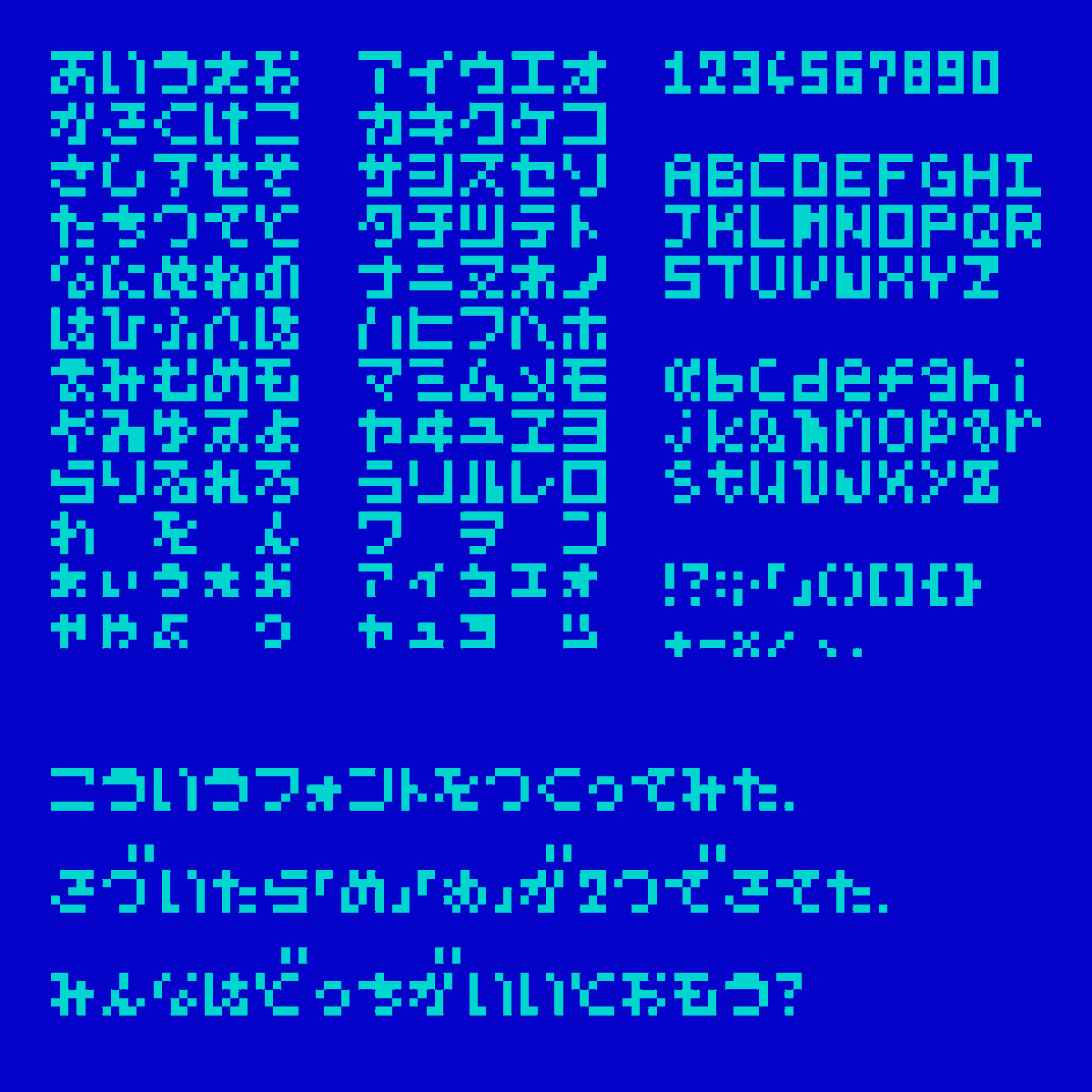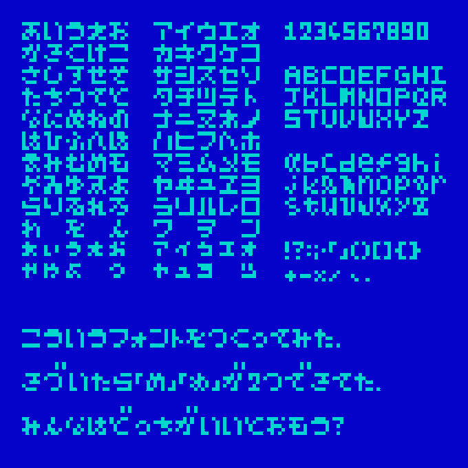 #5x5ピクセルフォントチャレンジ 昨日のフォントは過去作かつ縛りありなので、新しく手癖で打った。 一晩寝かせたり実際に使ってみての調整は要るだけど、それなりに気に入った。しかしまあ「ほふねむれゐぬ」の並びは可読性の試練だ。