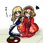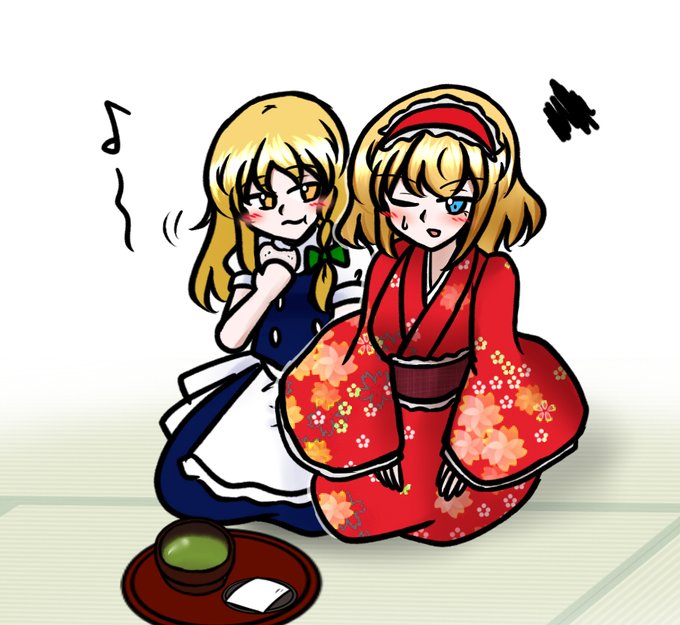 魔理沙「流石アリス、本格的じゃないか」 アリス「だったらアンタも少しはちゃんとした姿勢で味わいなさいよ…」#6月16日はマリアリの日 ちょいオーバーしちまったけどマリアリで和菓子の日な楽描き。アリスは人間達より凝ってそう。