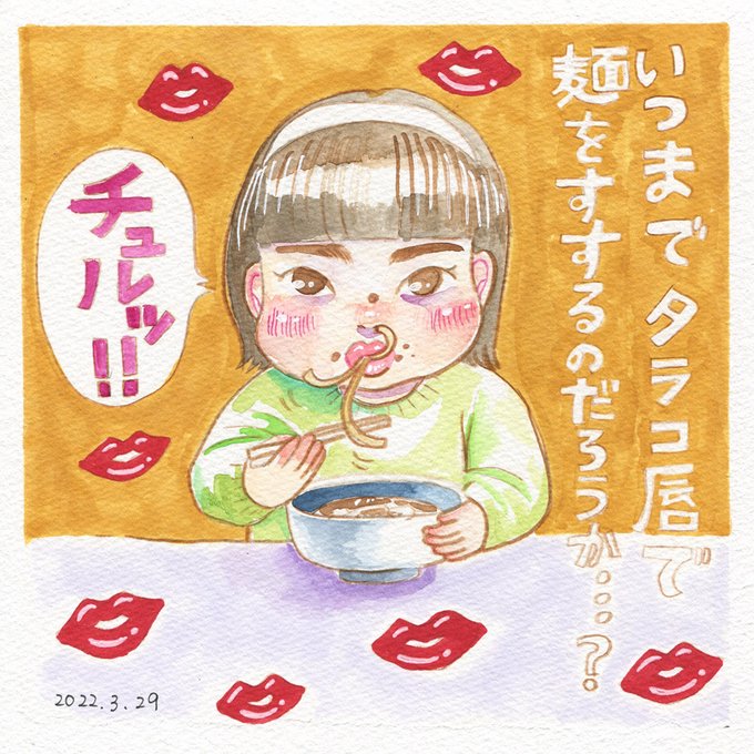 2022.3.29 いつまでタラコ唇で麺をすするのだろうか…? 大人みたいにズゾッといけるようになるのは いつ頃からなのかなあ。 #illustration #イラスト #育児日記 #育児漫画 #透明水彩 #6歳育児 #ステップファミリー #絵描きさんと繋がりたい #エッセイ #エッセイ漫画 #日常漫画