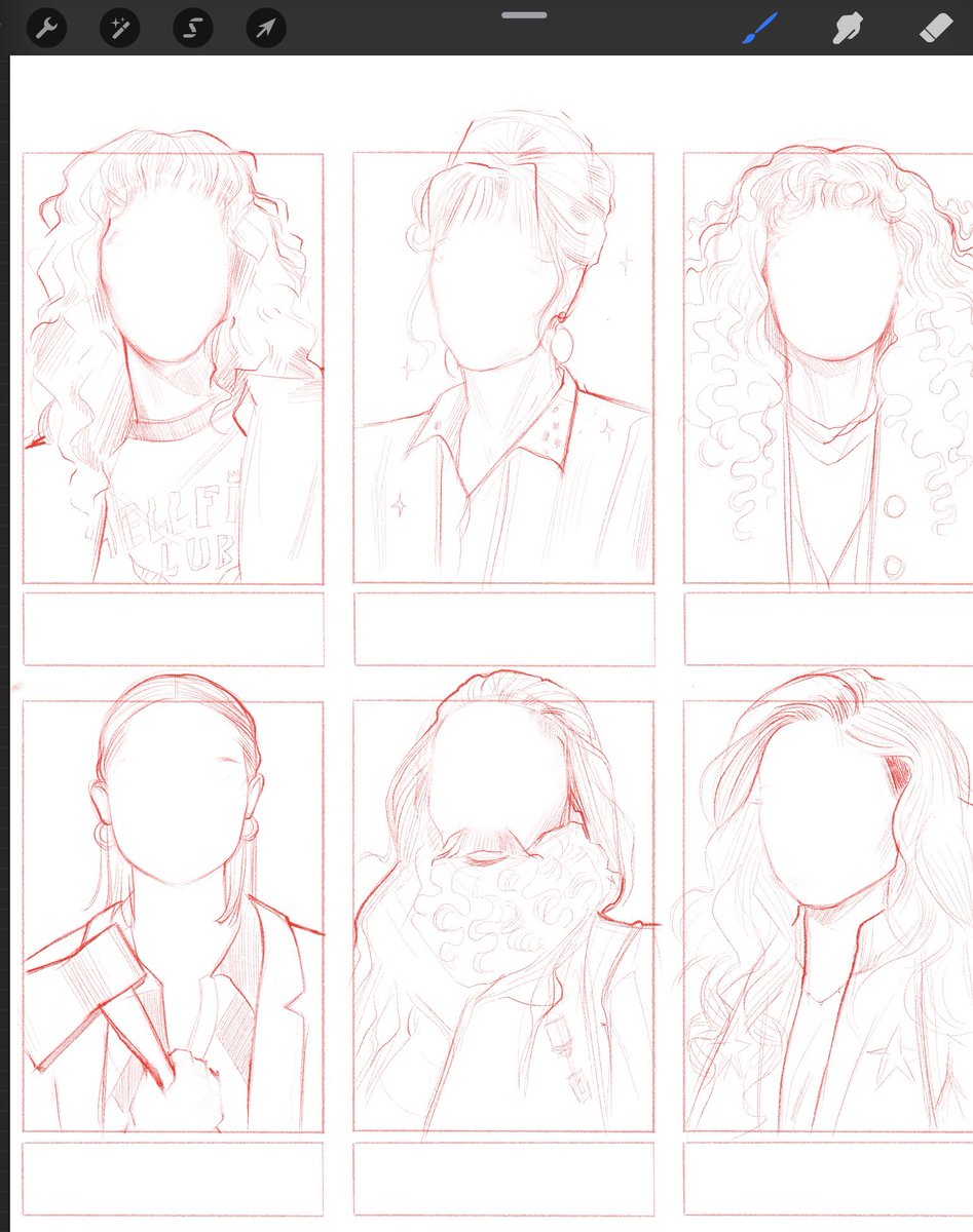 working on a new #6fanartschallenge to try to get out of this artblock and it's working so far! just finished the sketches, recognize anyone?👀