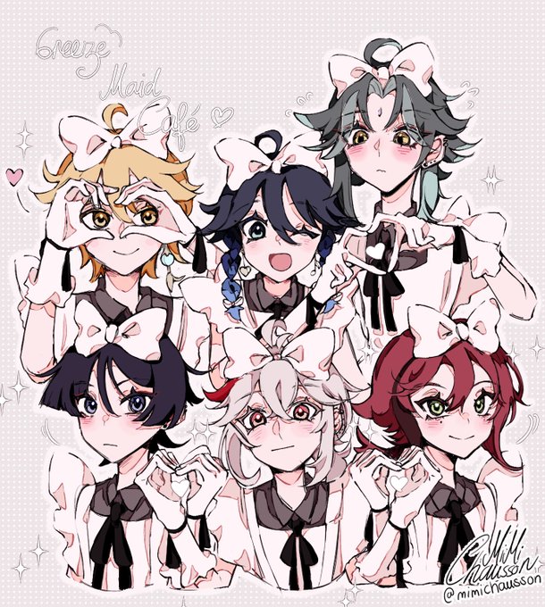 6reeze Maid Café <3 btw everyone is sitting except xiao lmao this is a belated birthday gift for my amazing friend @ceew00 <3 !! 🥹 hope u like it! #anemoboys #Genshinlmpact #6reeze