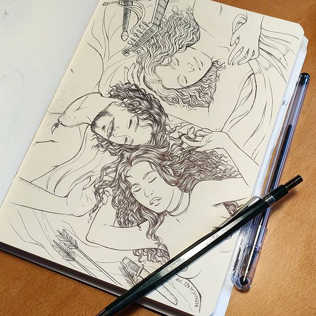 Lineart is done! Now I want to color it! Astrid, Francesco & Rudolf from our #7thSea campaign. Sleeping after some fun time together. #Inktober2019 #inktober #love instagram.com/p/B3o9oTriooS/