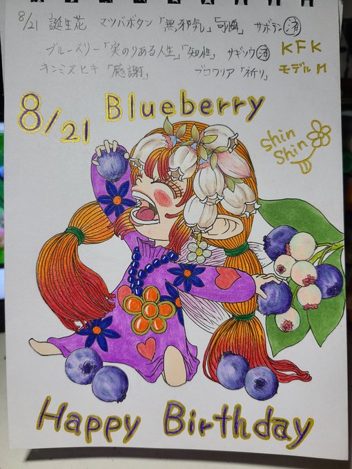 8月21日生まれの皆さん誕生日おめでとう😁😁✨ #8月21日 #毎日誰かの誕生日 #誕生日 #花の妖精シリーズ #誕生花 #花言葉 #毎日投稿 #イラスト #誕生日おめでとう #HAPPYBIRTHDAY #ブルーベリー #花のある暮らし #花 #illustration #handdrawing #オリジナルキャラクター