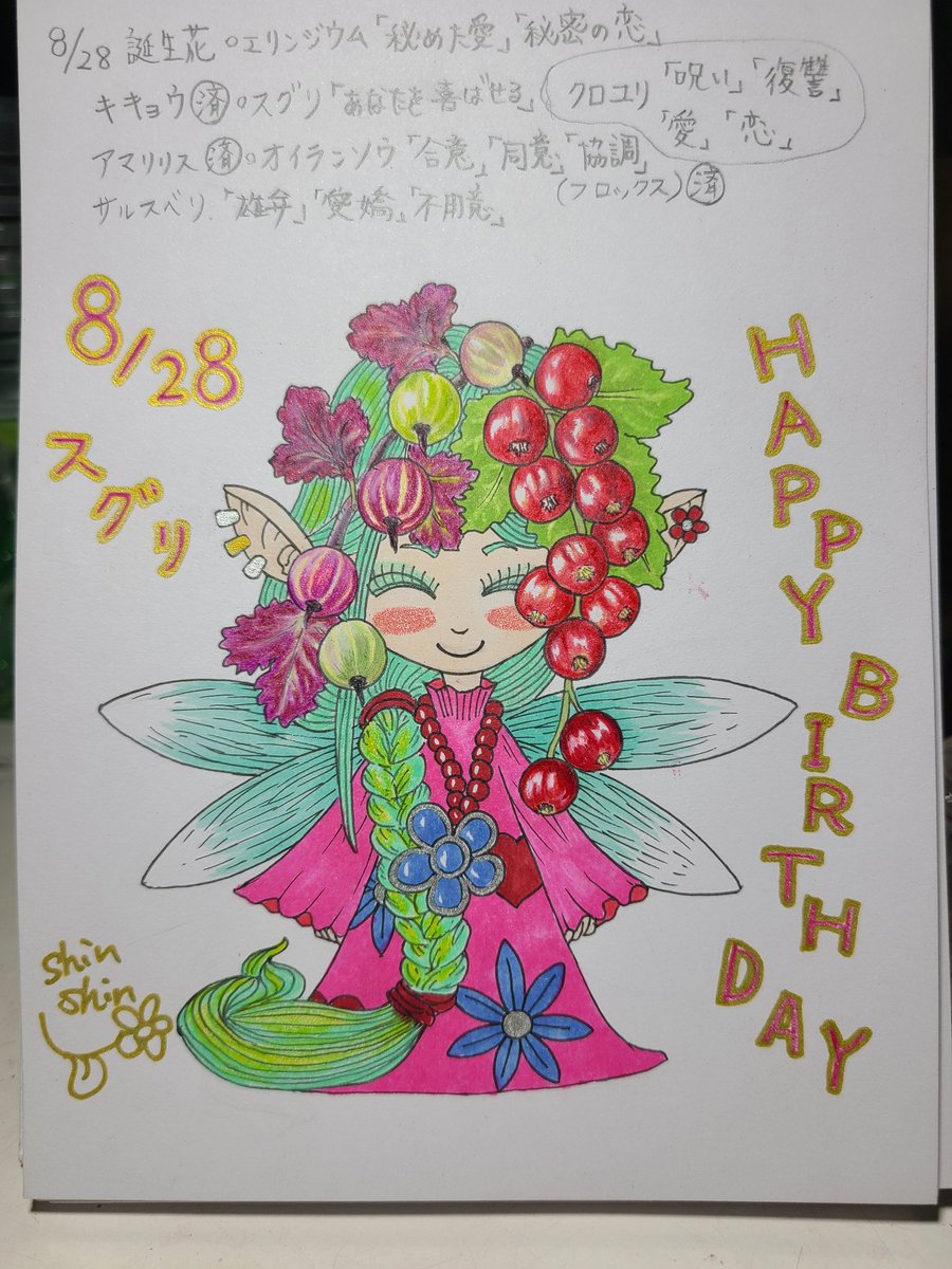 8月28日生まれの皆さん誕生日おめでとう😁✨ #8月28日 #毎日誰かの誕生日 #誕生日 #花の妖精シリーズ #誕生花 #花言葉 #毎日投稿 #イラスト #誕生日おめでとう #HappyBirthday #スグリ #花のある暮らし #花 #illustration #handdrawing #オリジナルキャラクター #多分私しかやってない