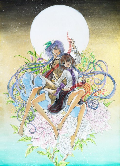 今夜は姉妹水入らずでお月見演奏会🎑 ポンポコ氷精さんもすすきの中から優しく見守ってます❄️🌾 #チルノ #九十九弁々 #九十九八橋 #深夜の真剣お絵描き60分一本勝負 (東方版・1658回目参加・お題フリー) (※1月27日お題) #九月十九日は九十九姉妹の日 #9月19日は九十九姉妹の日 #お月見