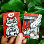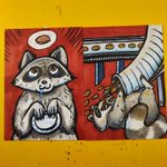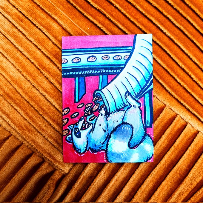 Day 19: Infinate The raccoon has hit the jackpot and living his best life at the cookie factory! I'm using inktober prompts from @coinswallow this year because they all sparked joy! #inktober2022 #coinswallowinktober #mask #inktober #drawtober #ATC #ACEO #artisttradingcard
