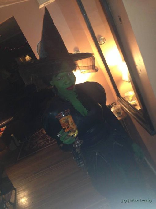 A fun side effect of cosplaying for years is the ability to be 100% comfy in full body paint & a latex ballgown. 😂 Here's me as Elphaba having a drink & hanging out with my friends @GayComicGeek & @RichAZak (aka Merlin & Son Goku) for day 46 of #ACosplayEveryDay. #cosplay
