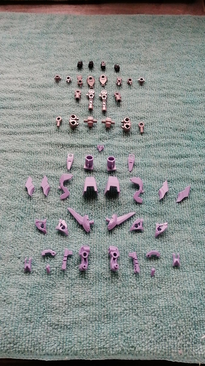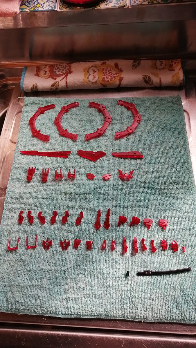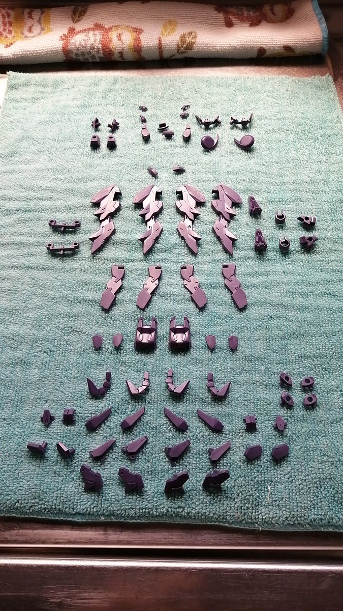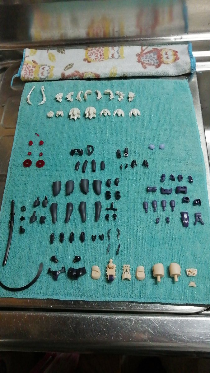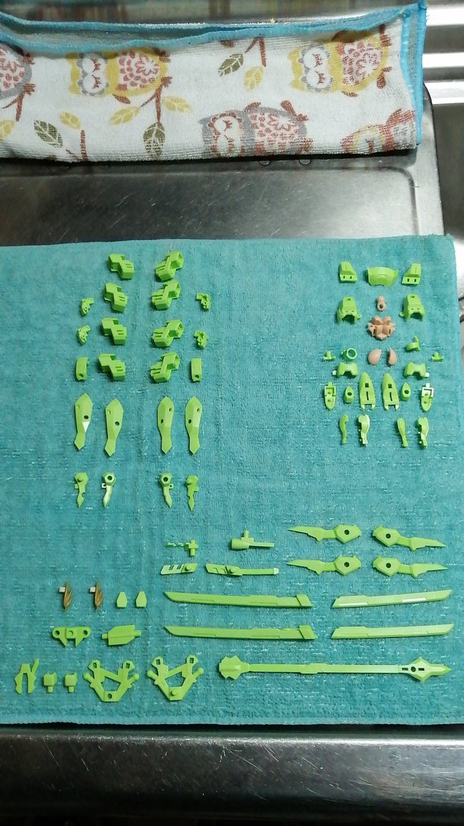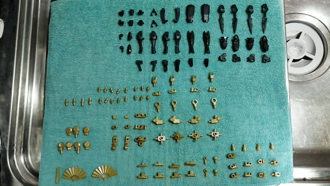 黄緑色のパーツ洗浄完了。 本体・ユニット・武器と、三種類の金色で塗り分けるので、このように並べています。 こうして整頓することにより、いつものパーツの紛失などないかの確認になるわけです。 #メガミデバイス #アスラ・タマモノマエ #ADHDライフハック