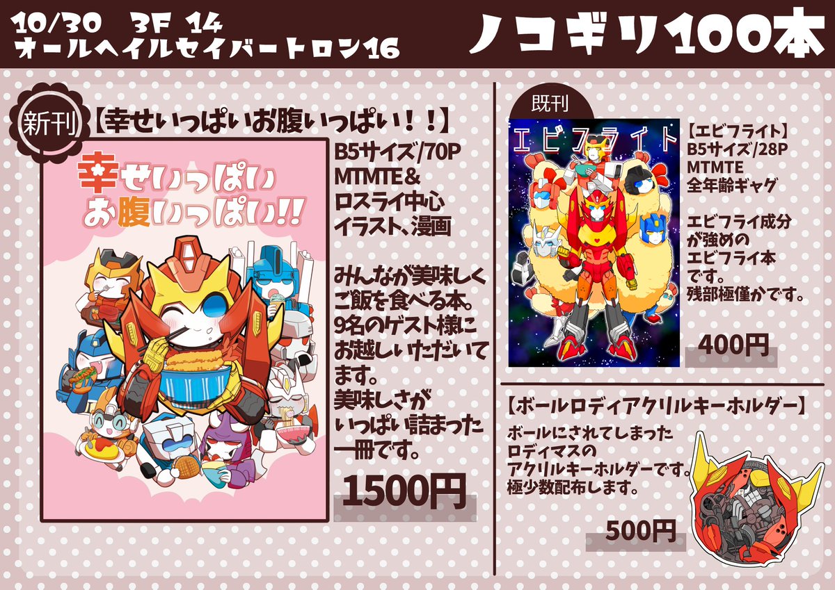 【宣伝】#AHCトロン16(10/30開催)での、当サークルお品書きを公開しました。 ご参加いただいた皆様の素敵なTF擬女化イラストが詰まった新刊の他に、既刊の持ち込みも予定!当日は何卒よろしくお願いいたします! その他詳細は以下URLにて。 #TF擬女化アンソロ #とりろじ24 imobi.no-mania.com/Entry/47/