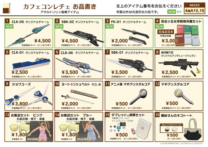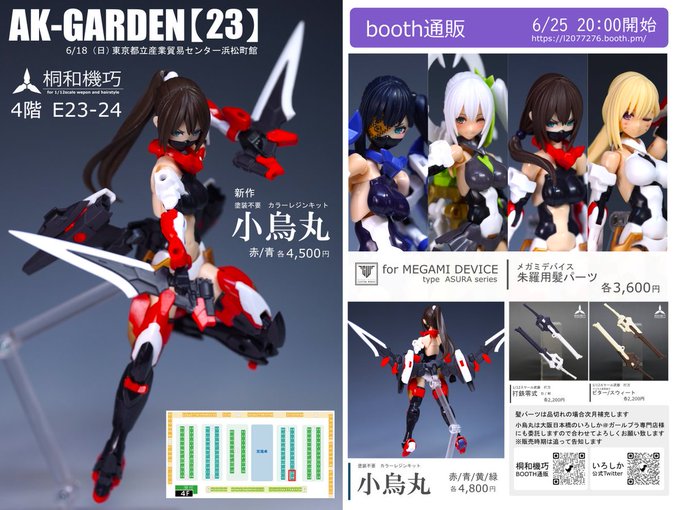 #AKガーデン 5階A 43-46 EFREET & 月面散歩 卓 樹からの販売物一覧です #メガミデバイス 及び #FAガール 等の1/12スケール、#デスクトップアーミー 向けバトルドレスシリーズと武器類新作と再販になります。 当卓他販売物は製作者の告知をお待ち下さい #AKG22 twitter.com/yfl019ada/stat…