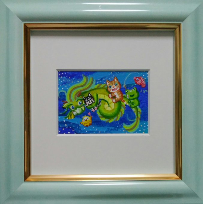 銀座中央ギャラリー 「ATCサイズ展」本日17:00まで 作品紹介 「Shichifuku nyanがいく!」 手のひらサイズで Shichifuku nyanが福を運んでいます😺🐸 昭和レトロなビルのギャラリーに来てにゃ😺✨ #銀座 #銀座中央ギャラリー #ATCサイズ #ミニ額 #猫イラスト #猫好き #イラスト #illustration