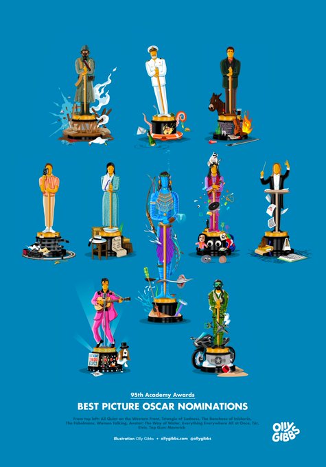 For my 10th and final year: Presenting the #Oscars illustration of the 95th @TheAcademy Awards Best Picture Nominees 2023! #Oscars2023 #AllQuietOnTheWesternFront #TriangleOfSadness #TheBansheesOfInisherin #TheFabelmans #WomenTalking #Avatar2 #EEAAO #TAR #Elvis #TopGunMaverick