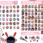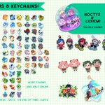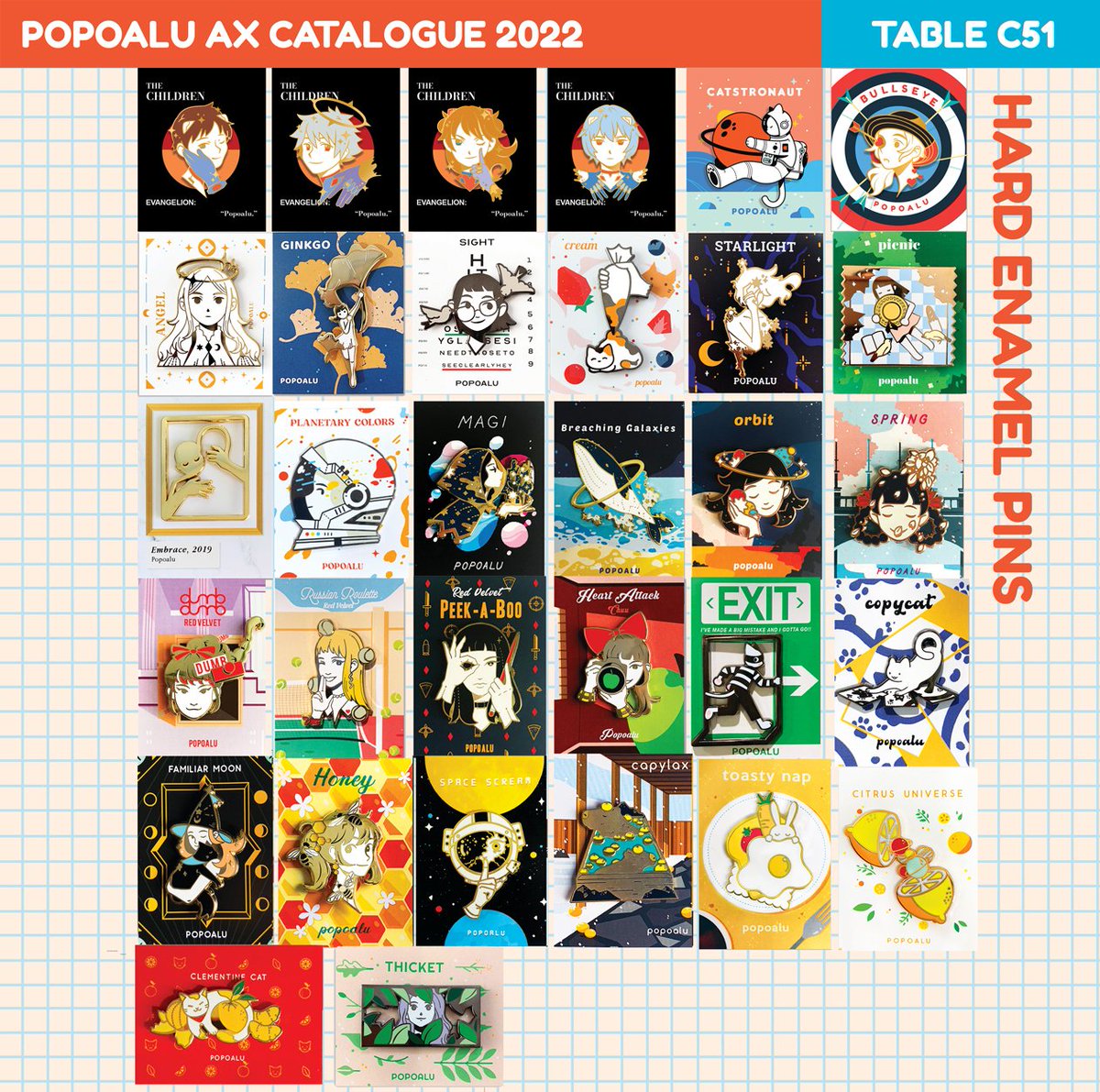 🌟 Presenting my merch catalog for #AX2022ArtistAlley ! 🌟 I'll be over at booth [ B6 ] with way more stuff at my booth than reasonably possible! I'll have more enamel pins than pictured here but for the most part this is everything I'll have in stock. [1/2]