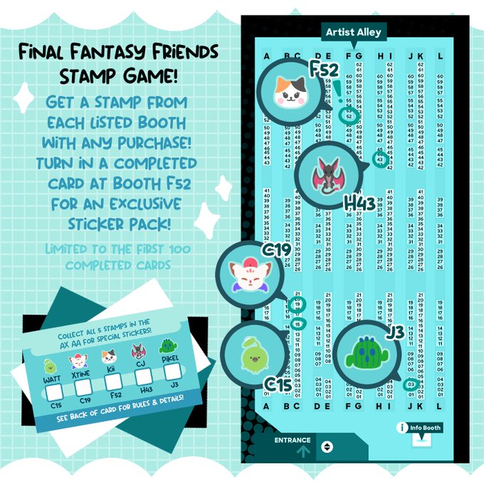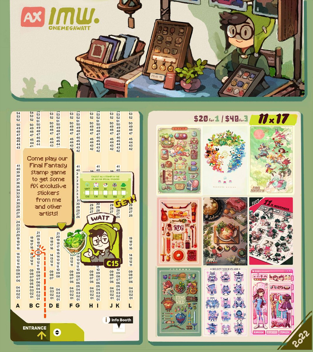 Please join @anewworldxtine, @onemegawatt, @cricketbat_, @StudioPikel, and I in the #AX2022ArtistAlley for a stamp collection game! Pick up a card at any booth & collect stamps w/a purchase from each of our tables! Get a pack of 5 stickers each of us designed on completion! ✨