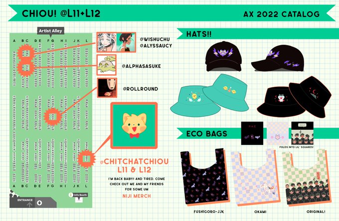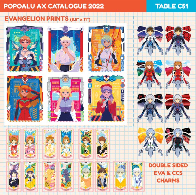 Hi! Heeere's my AX catalogue! Lots of evangelion stuff :o), hats, shirts, phone grips, and mooore! I'll be at table C51 with @alphasasuke ! We're all the way in the back, come say hi :o) #AX2022ArtistAlley