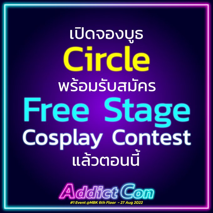 อัดแน่น! เปิดหมดทั้งสามกิจกรรม . จองบูธ Circle ได้ที่: bit.ly/ADCBoothReserve สมัคร Cosplay Contest ได้ที่: bit.ly/ADCCosContest สมัคร Free Stage ได้ที่: bit.ly/ADCFreeStage 🌟 "Addict Con" 27 ส.ค. นี้ @MBK Center ชั้น 6 . #AddictCon #Cosplay #VtuberThai #MBKCenter