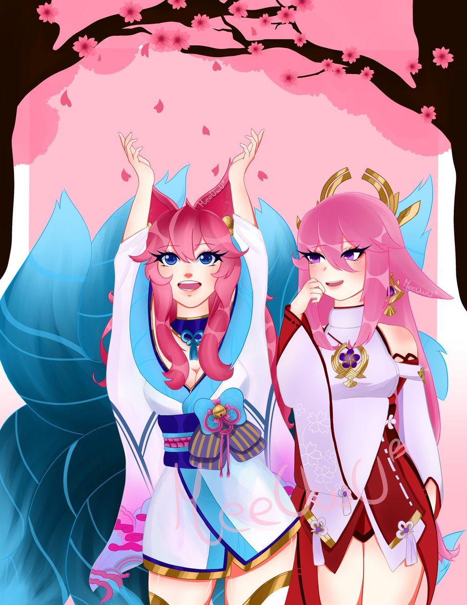 Fondo de ahri con Yae son mis favoritas 👉👈 😍✨😍✨🌸✨🌸✨🌸😍😍😍 #LeagueOfLegends #genshinimpactfanart #yaemiko #ahriversary #WaifusCentral