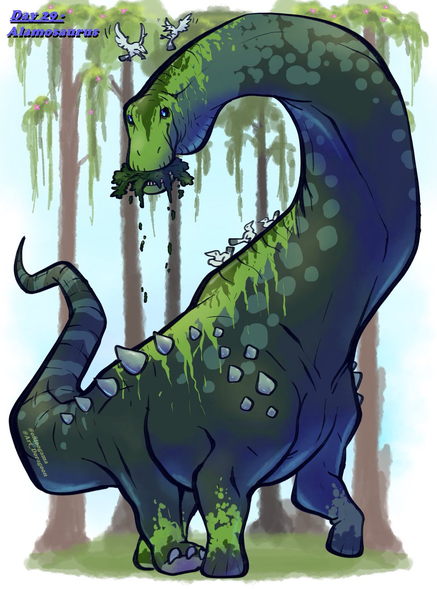 Day 29 - Alamosaurus ~ Titanic sauropod that inhabited North America during the Late Cretaceous. Alamosaurus was a giant herbivorous dinosaur, due to their size, healthy and fully grown individuals fear no predators, especially Tyrannosaurus. #paleoart #Alamosaurus