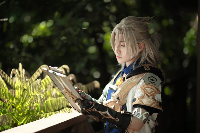 "Ample light... active biological organisms... Yes, this is a good place to sketch." Albedo for Albedo banner. Please come home early this time 😔 📷: @Huzafan Edit: @enchantressEri #Albedo #albedocosplay #GenshinImpact #genshintwt #cosplay
